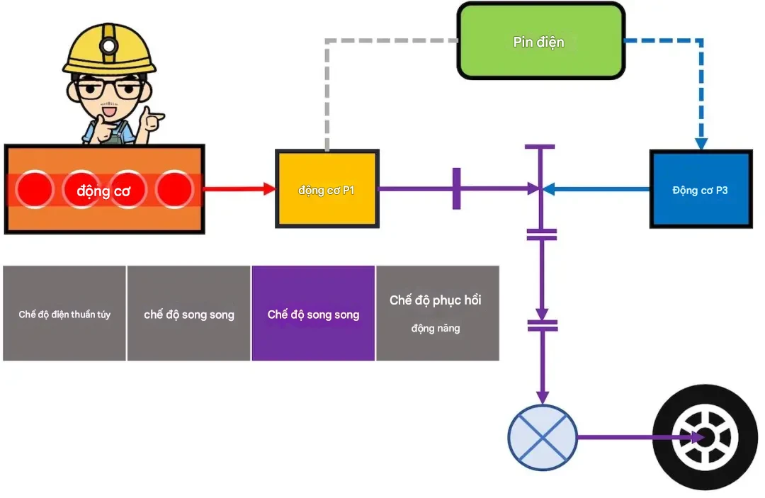Nguyên lý: Cả động cơ xăng và mô-tơ điện đều được kết nối trực tiếp với hệ truyền động của xe, giúp chúng có thể cùng lúc truyền động cho bánh xe.