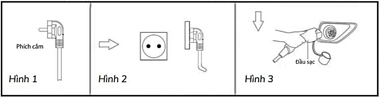 Bước 2: Mở nắp sạc xe điện, cắm đầu sạc vào cổng sạc trên xe (Hình 3). Bộ sạc tự động sạc cho xe – đèn đỏ sáng, đèn xanh nháy 1 lần/ 1 gây.