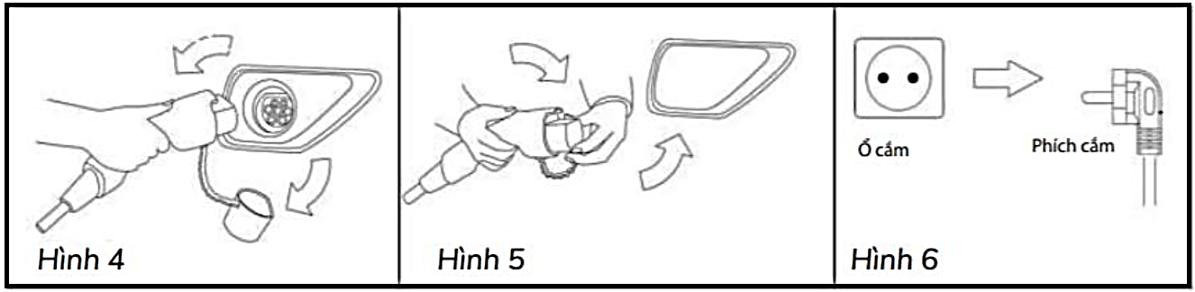 Bước 4: Rút đầu sạc ra khỏi xe (Hình 4), đóng nắp bảo vệ cổng sạc trên xe, sau đó đóng nắp bảo vệ đầu sạc của bộ sạc (Hình 5).