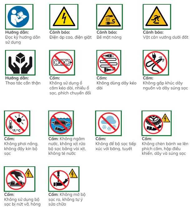 · Đọc và làm theo các hướng dẫn an toàn trong sách hướng dẫn sử dụng sạc và trong sách hướng dẫn sử dụng xe.