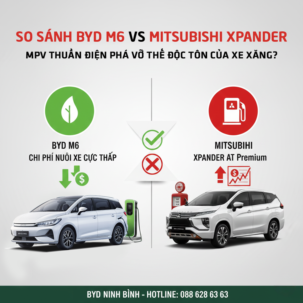 Mitsubishi Xpander từ lâu đã là "vua doanh số" trong phân khúc MPV 7 chỗ tại Việt Nam. Tuy nhiên, sự xuất hiện của BYD M6 – mẫu MPV thuần điện (EV) với mức giá cạnh tranh – đang đặt ra một câu hỏi lớn: Giữa xe xăng (Xpander) và xe điện (M6), đâu là lựa chọn tối ưu hơn cho gia đình và kinh doanh dịch vụ?